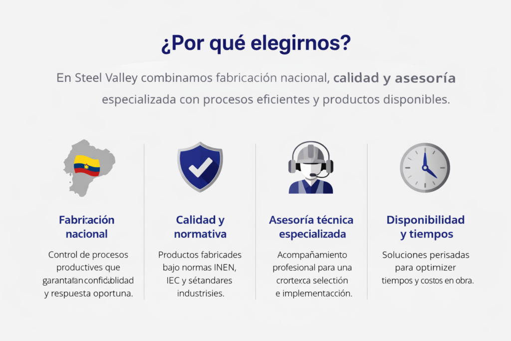Steel Valley es una empresa ecuatoriana de fabricación metalmecánica especializada en soluciones para proyectos eléctricos e industriales. Nacemos con la visión de ser un aliado confiable para ingenieros, contratistas y empresas, combinando calidad, innovación y un servicio cercano que entiende las necesidades reales de cada proyecto. Más que fabricar productos, buscamos aportar soluciones técnicas, cumplir los tiempos de entrega y acompañar a nuestros clientes con asesoría experta, porque creemos que cada proyecto merece respaldo, precisión y confianza.